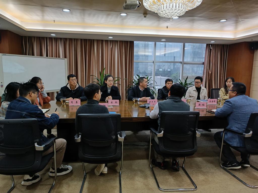 一行的到访表示了热烈欢迎。黄涛从企业概况、发展方向、科技创新、业务项目等方面进行介绍,黄维就目前公司项目所涉及的专业方向做了全方位的介绍。