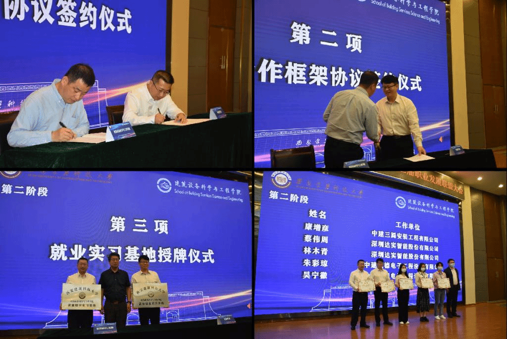 学院副院长冯增喜代表学院与中建三局安装工程有限公司西北公司副总经理、2006届暖通校友康增彦,深圳达实智能股份有限公司高级工程师蔡伟周进行了校企合作框架协议签约。学院院长李安桂为两家单位授予“就业创业实习基地”标牌。教务处副处长袁广亮为中建三局安装工程有限公司西北公司副总经理、2006届暖通校友康增彦,深圳达实智能股份有限公司高工蔡伟周、林木青和中建凯德电子工程设计有限公司设计总监吴宁徽、招聘主管朱彩琼5位职业导师颁发聘书。深圳达实智能股份有限公司高级工程师蔡伟周代表公司发布了联合毕业设计实践训练课题。