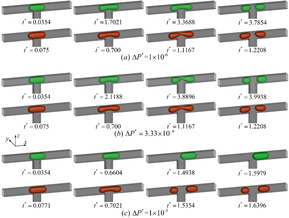 在较小压强差下(图2a),干净和含表面活性剂液滴均破裂成近似等体积的两个子液滴;在中等压强差下(图2b),干净液滴破裂成体积不等的两个子液滴,而含表面活性剂液滴仍然破裂成体积近似的两个子液滴;在较大压强差下(图2c),干净液滴完全由通道一侧流出,而含表面活性剂液滴仍然破裂成两个子液滴。表面添加表面活性剂能抑制液滴非等体积破裂,为提高基于液滴微流控设备的精度和灵敏性提供了理论和技术支撑。