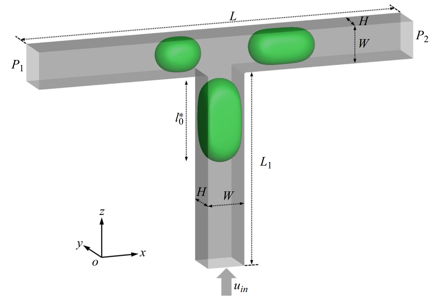 国家发展改革委最新印发的《“十四五”生物经济发展规划》中明确指出,要开展前沿生物技术创新,“加强微流控、高灵敏等生物检测技术研发”。为提高基于微液滴开发仪器的精度和灵敏度,对精确控制微通道内生成液滴的尺寸和均匀性提出了更高的要求,而这依赖于对液滴颈部失稳机理的研究。微液滴生成常采用T型通道,其尺寸一般为微米级别,因此任何存在于微通道内的微小缺陷都会影响生成液滴的均匀度。如图1所示,垂直通道入口为速度入口,水平分支通道出口为压强出口,本文将微通道内缺陷产生的非对称性归纳为分支通道两侧压强差(P1和P2之间差值),并采用格子玻尔兹曼颜色梯度模型模拟表面活性剂对通道内非对称缺陷的抑制作用。
