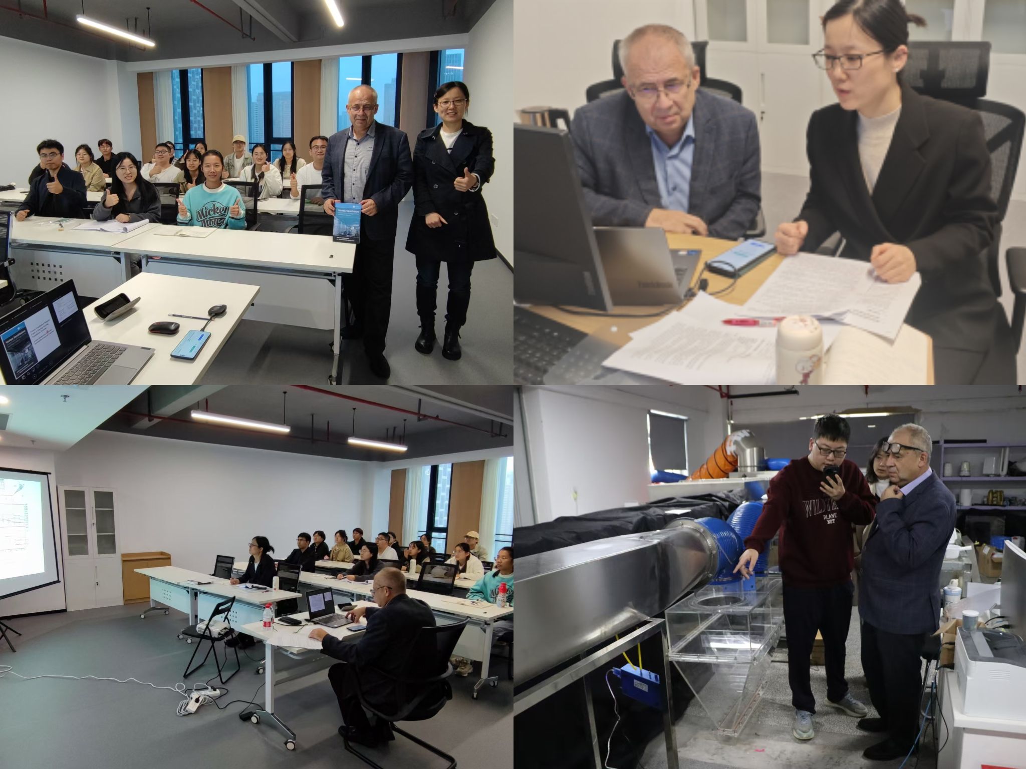 交流期间,Konstantin Logachev 教授开展了形式多样的学术活动,包括系列专题报告、研究生指导、合作研究研讨与实验指导等。在专题报告中,他系统介绍了自己的专著、近年研究进展及研究方法,并重点讲授了局部排风罩及相关部件降阻方法、减少粉尘卷吸的工程策略等。在与研究生的一对一交流中,他针对博士生和硕士生的研究课题,就数据分析与数学建模等方面给予细致指导,并对期刊论文稿件提出具体修改意见。在合作研究方面,他与黄艳秋教授深入探讨了合作项目的具体内容,明确了阶段目标与任务分工,有效推进了后续联合研究计划。此外,Konstantin Logachev 教授还参观了实验平台,了解其功能,并就正在开展的实验提供了理论指导和改进建议。