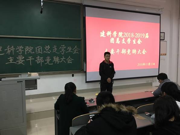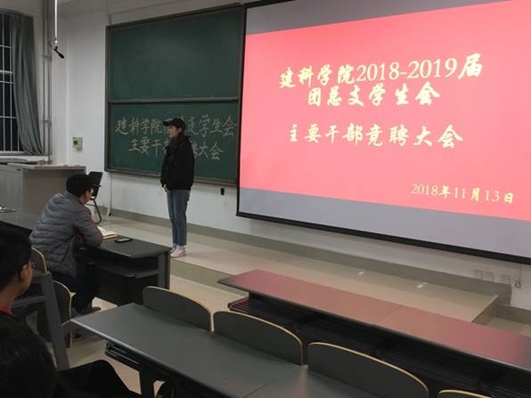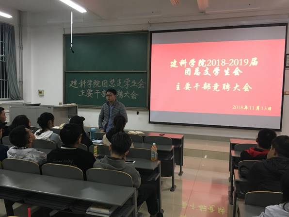 于11月13日晚在草堂校区学府城8栋206举行建科学院2018-2019届团总支学生会主要干部竞聘大会。参加大会的有2017级本科生辅导员王翼杰、2018级本科生辅导员朱海琦以及2017级团支部成员。