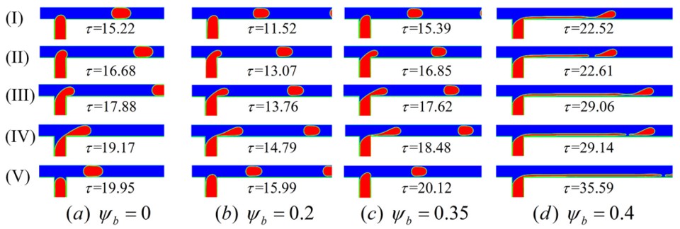 1.液滴在固体壁面的运动、变形和破裂现象广泛存在于石油、化工和环境领域,如土壤地下水修复、提高油气采收率和二氧化碳地质封存等。在上述过程中,添加表面活性剂会显著地减小两流体间的界面张力和改变壁面润湿属性,导致含表面活性剂液滴动力学行为与干净液滴存在显著差异。课题组根据杨氏方程和Langmuir状态方程建立了接触角与表面活性剂界面浓度之间的函数关系,并通过接触角几何公式实施动态接触角,在格子玻尔兹曼框架下发展了包含表面活性剂浓度影响的润湿边界条件;研究了库塔流中含表面活性剂的液滴在静止壁面上的运动、变形及破裂行为,并对比分析了表面活性剂在不同粘性比下对液滴破裂临界毛细数的影响规律。