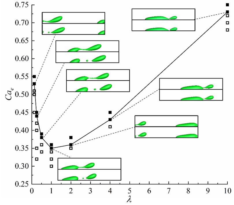 图1不同粘性比下干净液滴的破裂临界毛细数